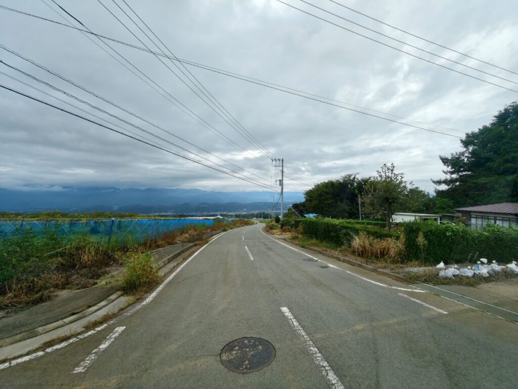 どんより曇り空の下、晴れていたら富士見パノラマスキー場の入笠山や八ヶ岳がドーンと眺められるはずの雄大な道を下っていきます。