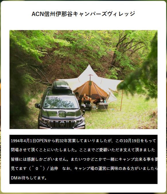 回数はそれほど多くないけど、我が家が昔からお世話になっているACN信州伊那谷キャンパーズビレッジさんが10月19日をもってキャンプ場を閉場したと・・・