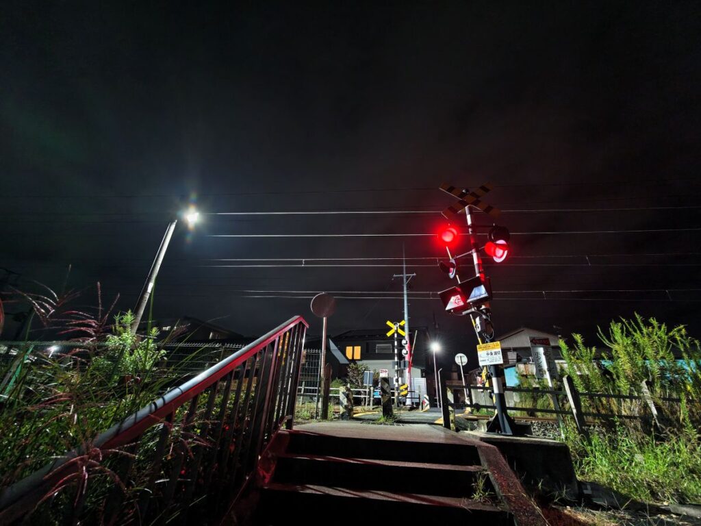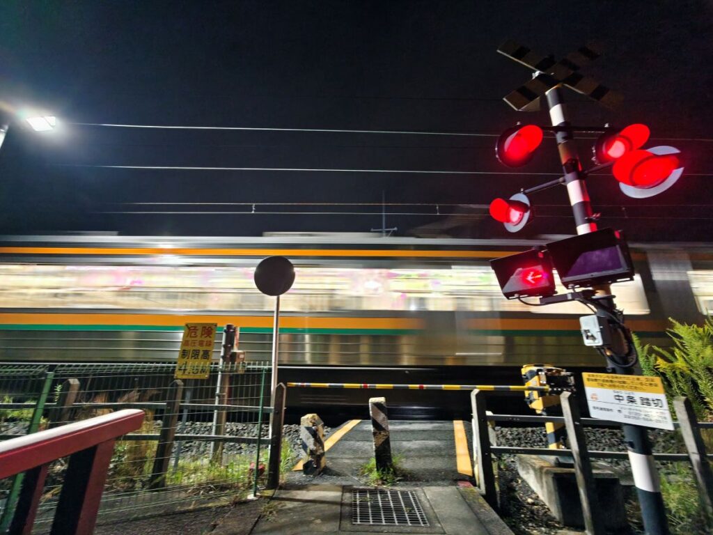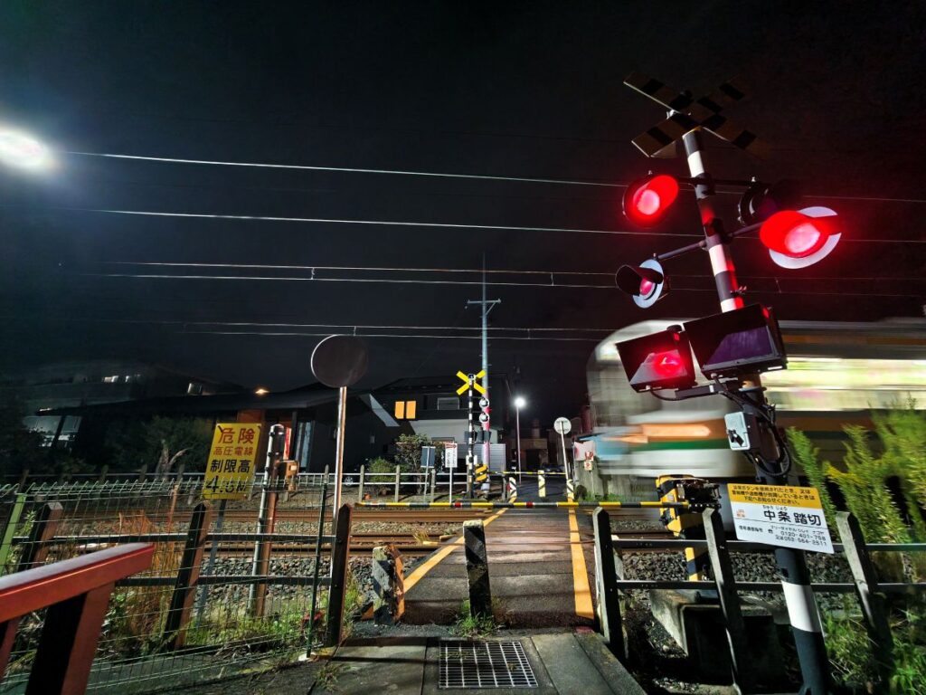 で、スマホを構えた状態で電車が目の前を通過するのですが、いくら夜景に強いとはいえ、やはりスマホではシャッターのタイミングが難しく思ったような構図にはなりませんでした。