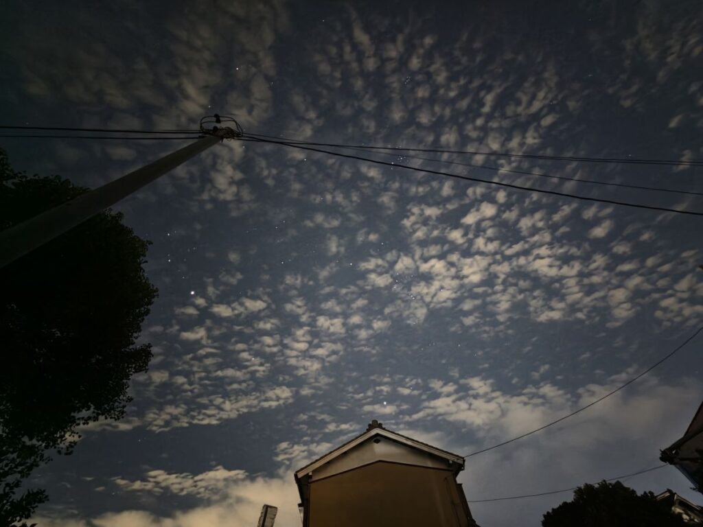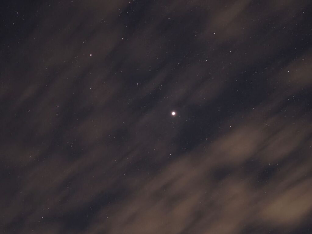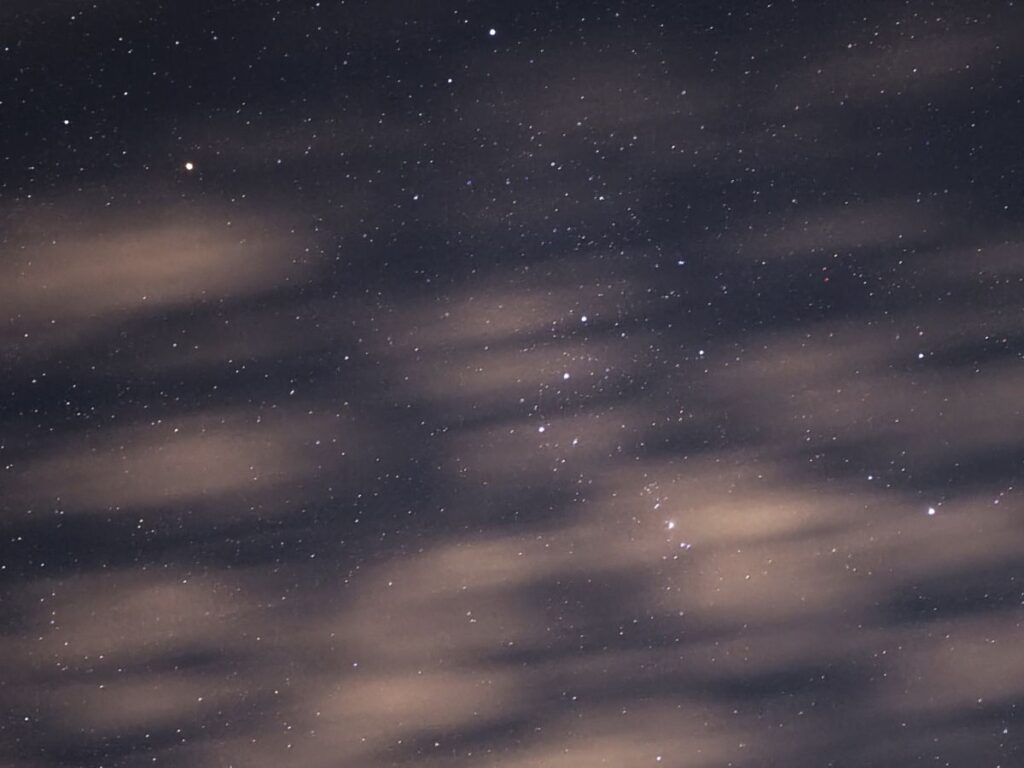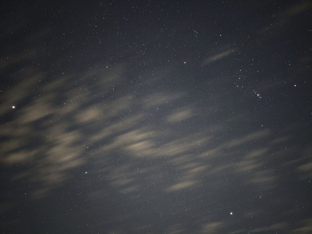 ちょっとうろこ雲の影響を受けすぎているのとやはり空が明るすぎるのとで星の存在感が薄いですが、それでもオリオン座からスバル(プレアデス星団)にヒアデス星団に木星、シリウスまでしっかり写っています。