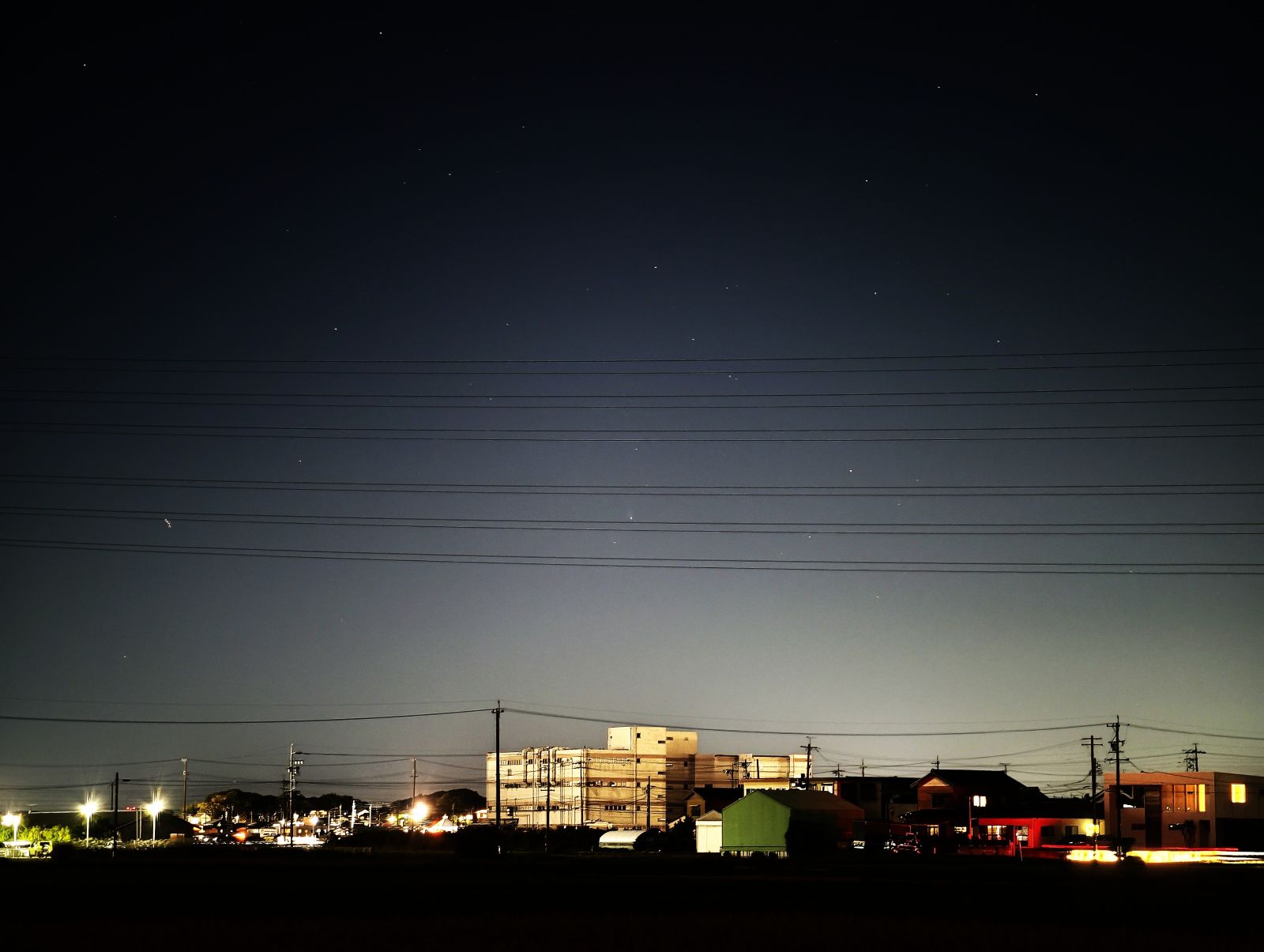 ということで、急激に寒くなってそれと共に空気が澄んで星空がきれいに見える日が増えてきましたが、月曜日は夜まで晴れて例のレモン彗星を観測できる最後のチャンスかもということで、カメラを三脚に乗せて双眼鏡を首からぶら下げて近所の車のめったに通らない田んぼ道へ行ってきました。