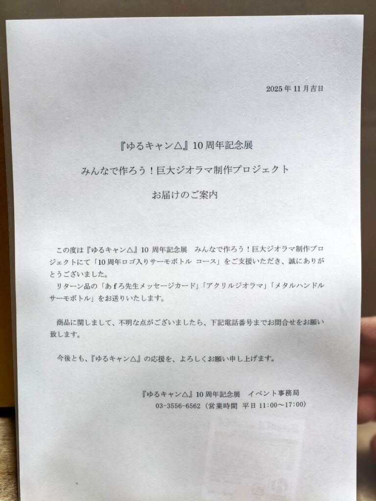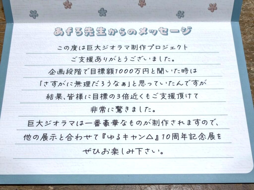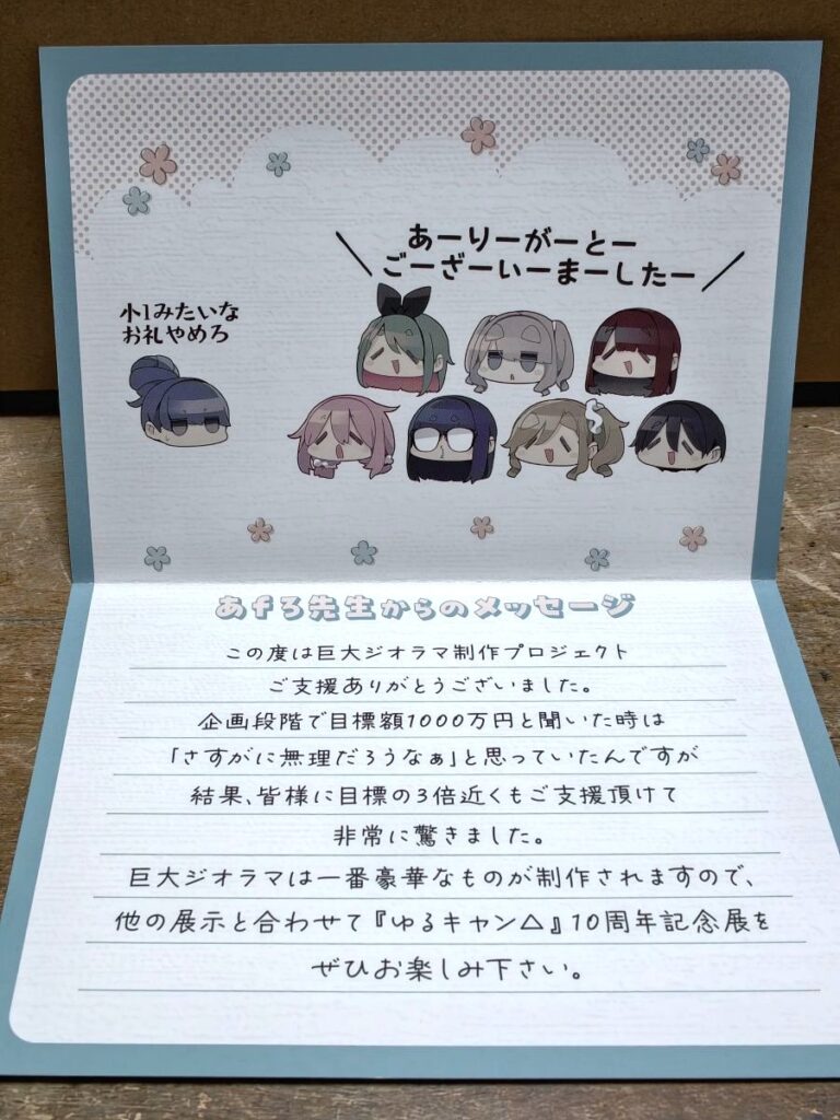 ということで、ゆるキャン△10周年記念展に向けたジオラマ作成クラウドファンディングへの参加結果報告でした。