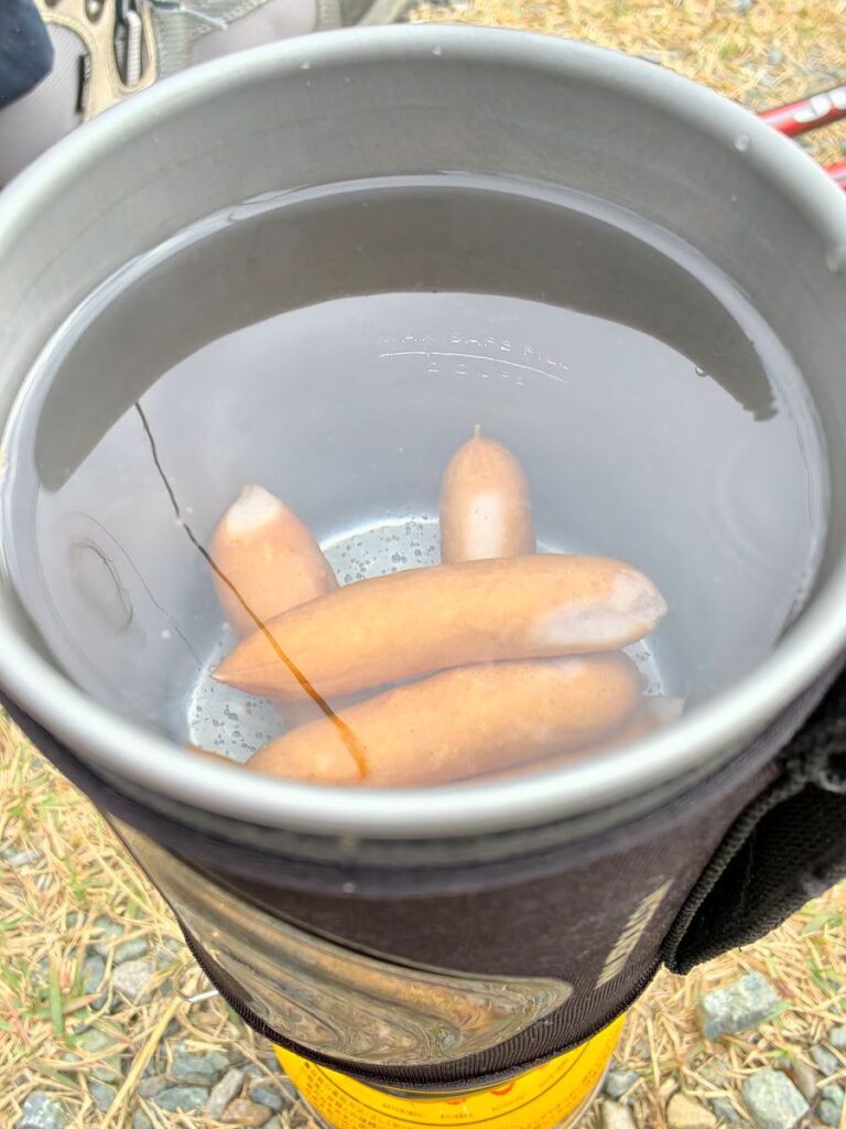 知り合いも到着していて、その横で持参した重い水とウィンナーとジェットボイルを使って調理開始