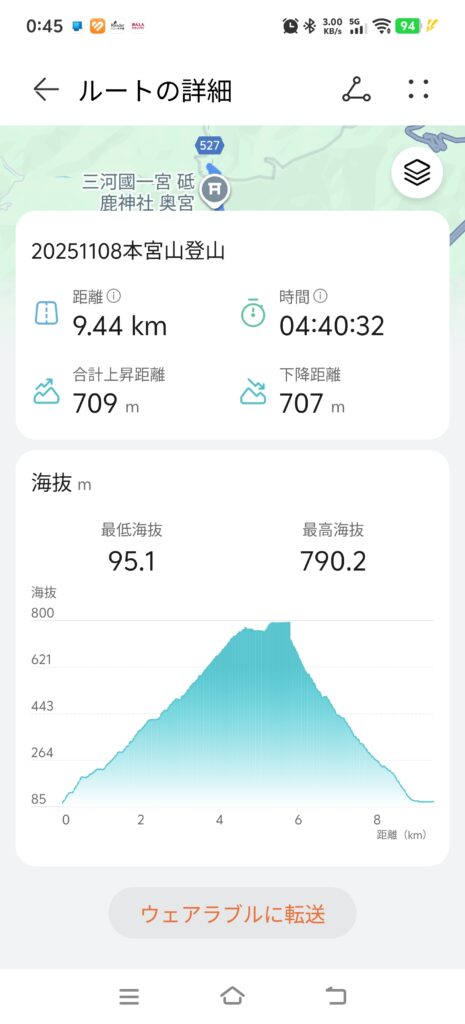 移動距離は9.44km、移動時間は4:40、合計上昇高度は709m、下降高度は707m