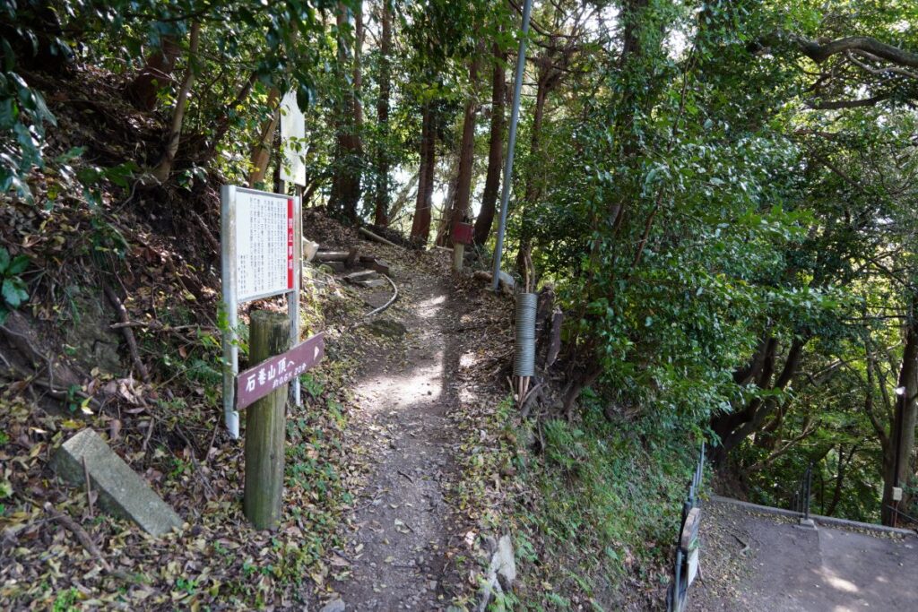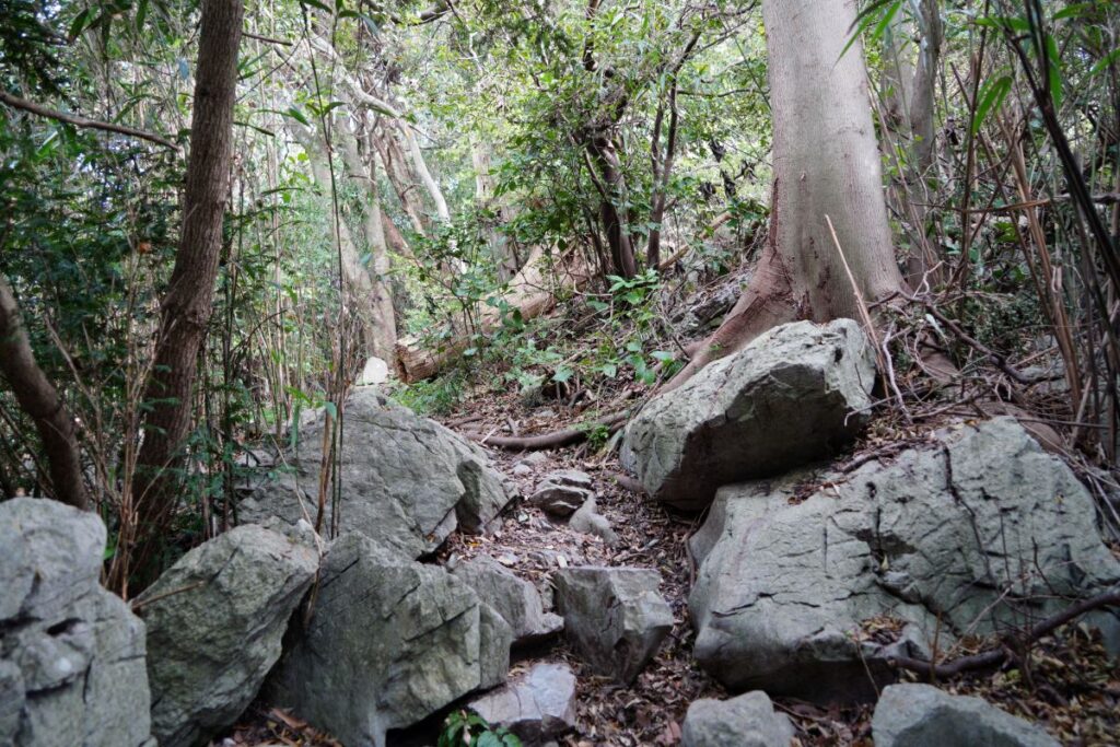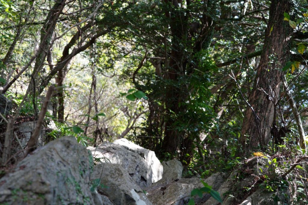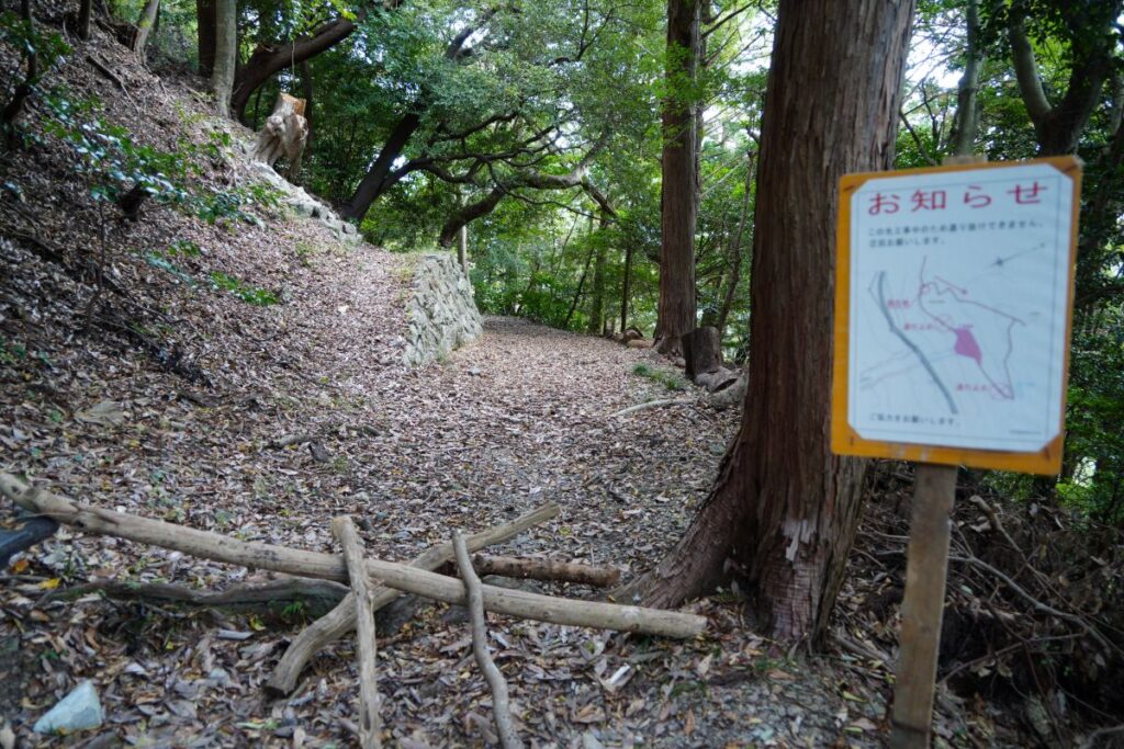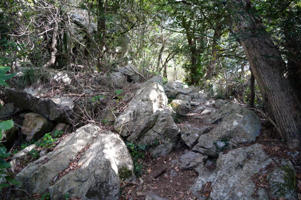 さらに進んで行くと山頂へ向かうルートと別のルートに分かれるのですがこちらは通行止めになっていますが、道の先に石垣が見えます。