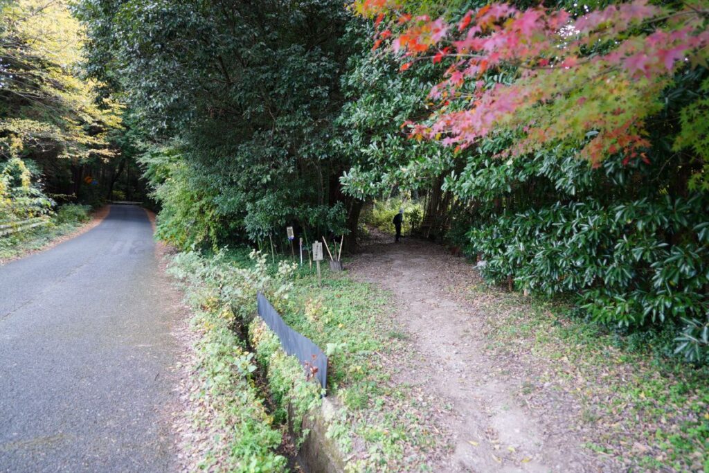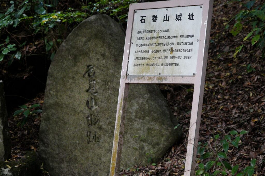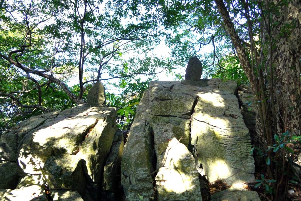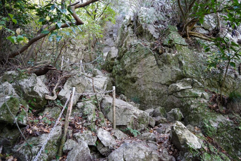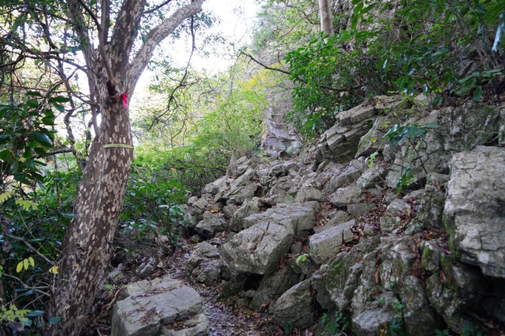 さらに進んで行くと山頂へ向かうルートと別のルートに分かれるのですがこちらは通行止めになっていますが、道の先に石垣が見えます。