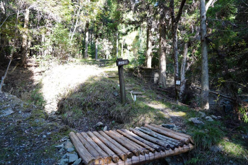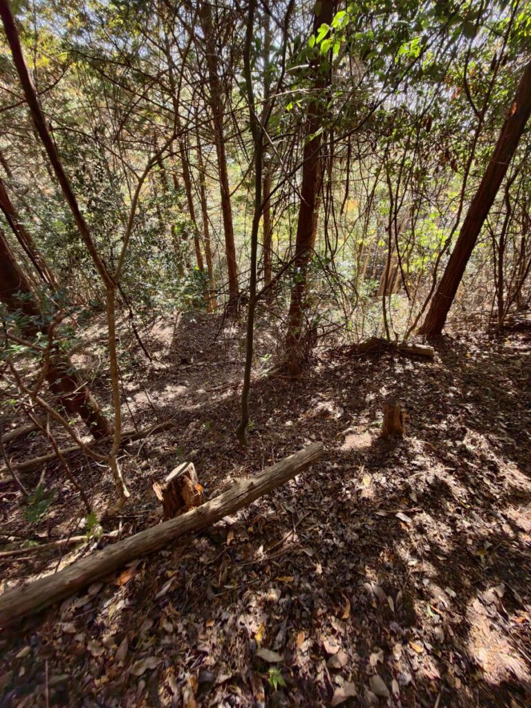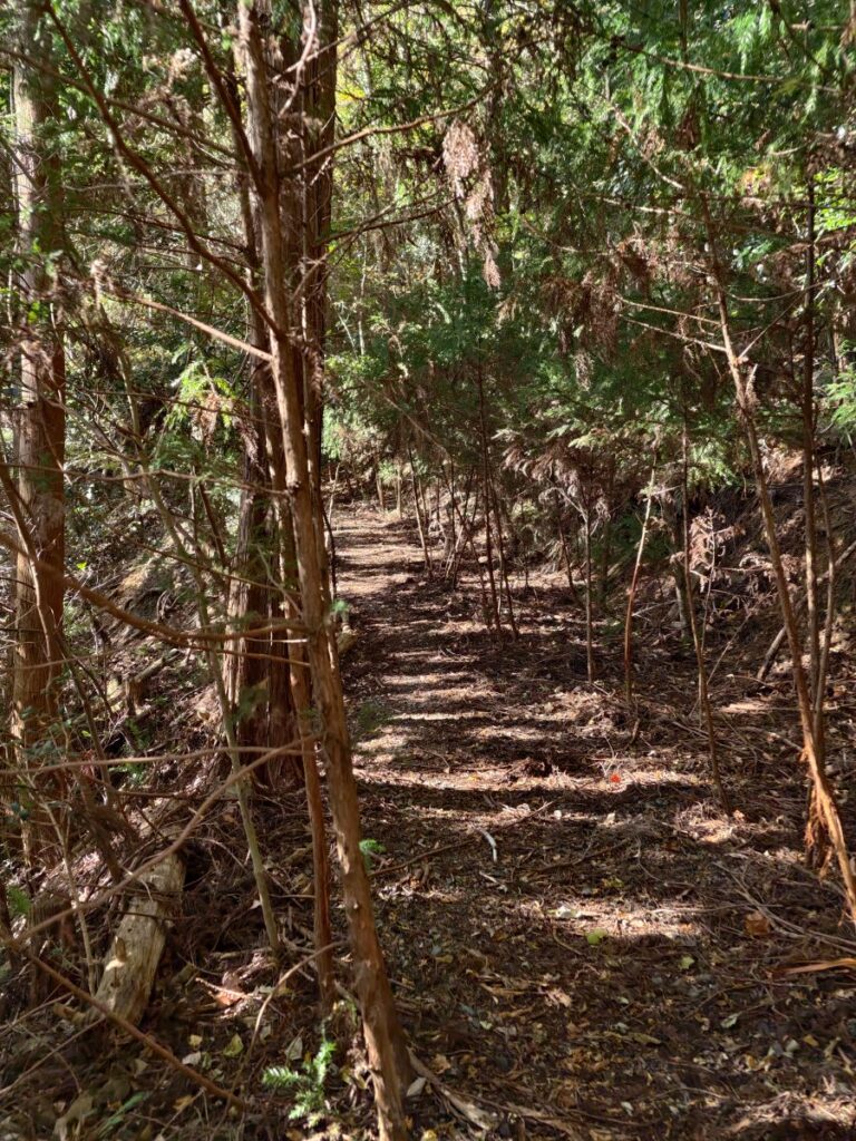 そしてここの急斜面を降りるとかつての林道らしき未舗装道へ出ます。