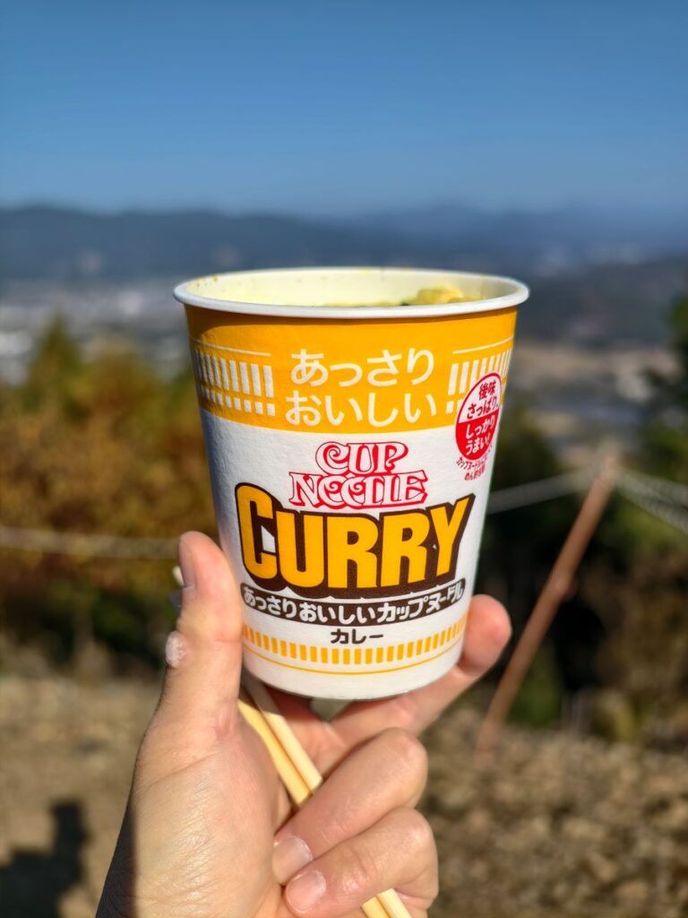 最近山にはカップ麺を食べるために登って来ているのではないかと思うほど山頂で食べるカップ麺が美味しくすっかりはまってますが、今回持参したのはゆるキャン△でおなじみのカップヌードルカレー味(^^;)
