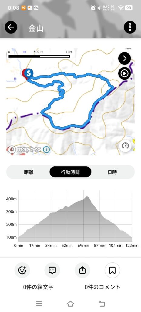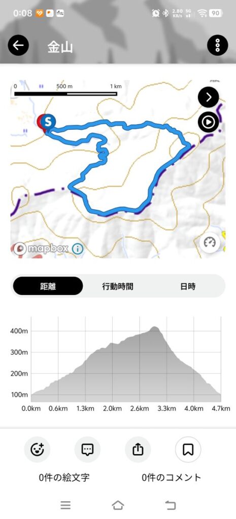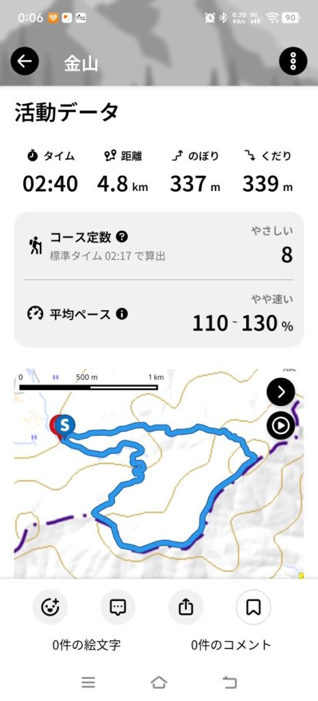 活動記録を停止するのを忘れて車で走り始めるところまで記録してしまいましたが、おおむね5kmの山歩きでした。