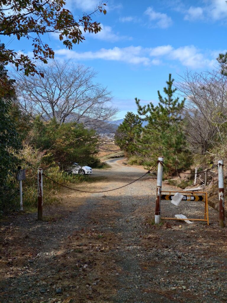 車両通行止めの鎖をくぐって駐車場を振り返るとぽつんとマークXが。
