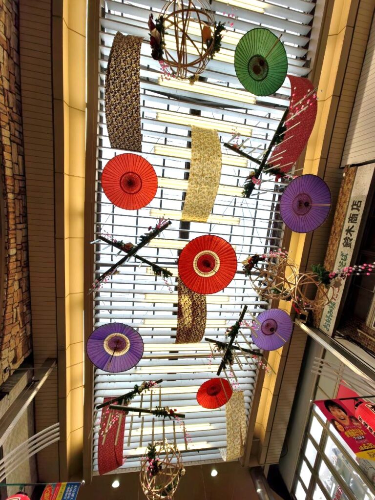 屋根につるされているから傘がカラフルできれいでした。