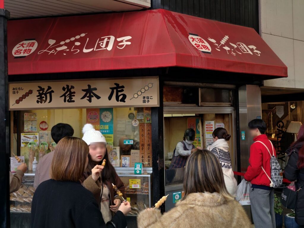 東仁王門通りを超えて、前日に「千原ジュニアの愛知あたりまえワールド」で”【永久保存版】愛知県民2万人に聞いた!推し神社&お寺ベスト10”という特集で大須観音が取り上げられていた時に紹介されていたこちらの団子屋さんがテレビ効果もあって長蛇の列ができておりました。