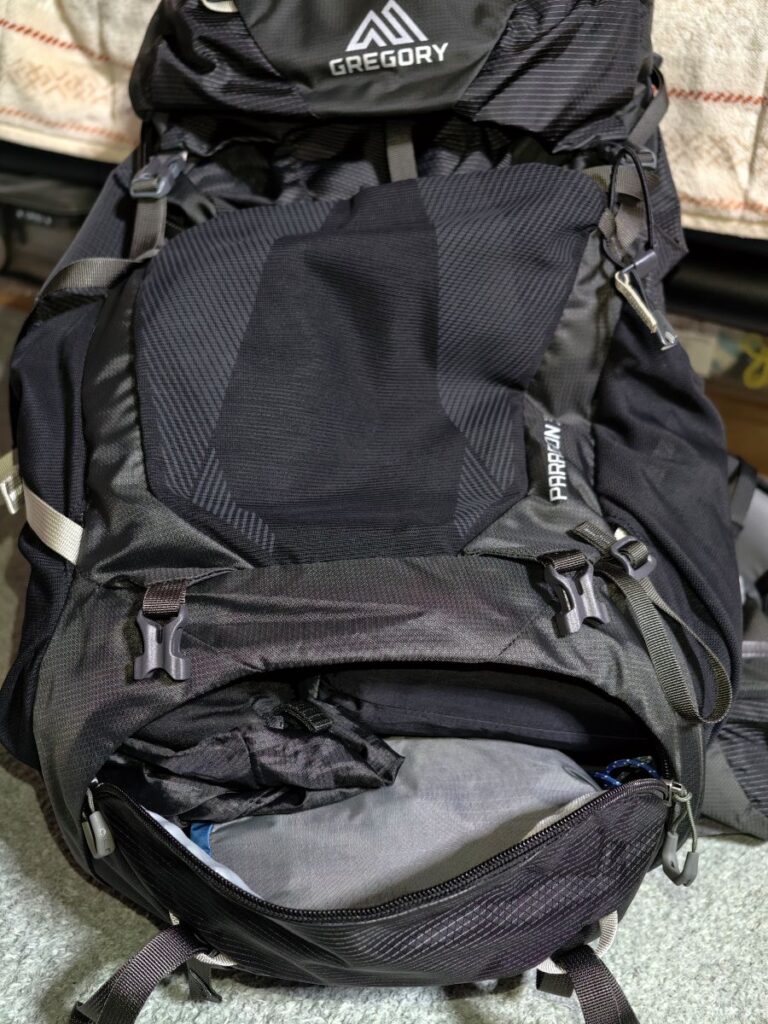 そして雨蓋式だと荷物の出し入れが面倒ですが、こちらは下側に荷室にアクセスできるジッパーによる開口部があります。