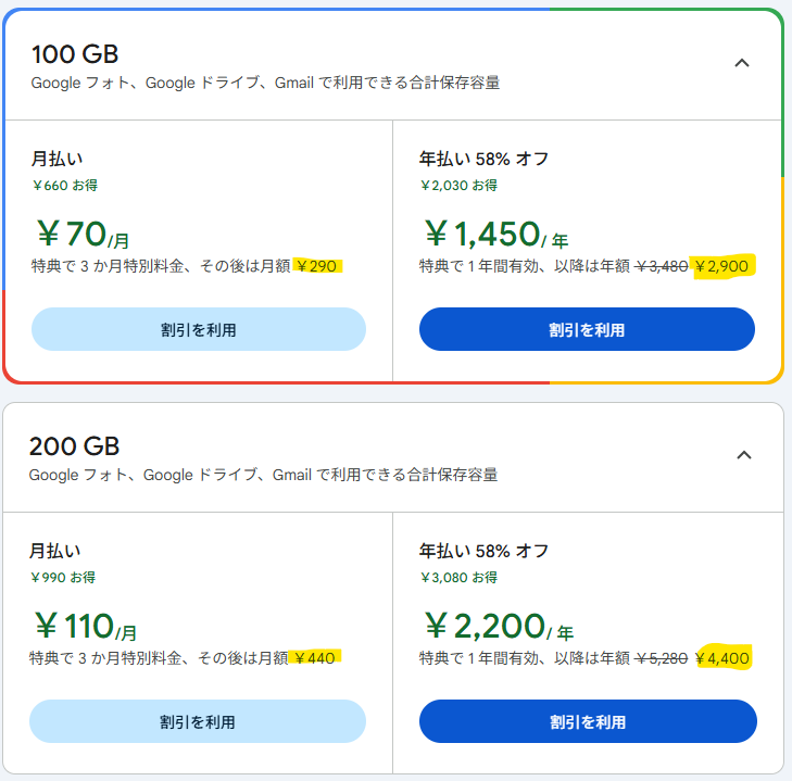 実際Googleさんの狙いは、追加のストレージ容量をサブスクリプションで購入し続けてもらうことにあると思うのですが、その料金プランはこちら