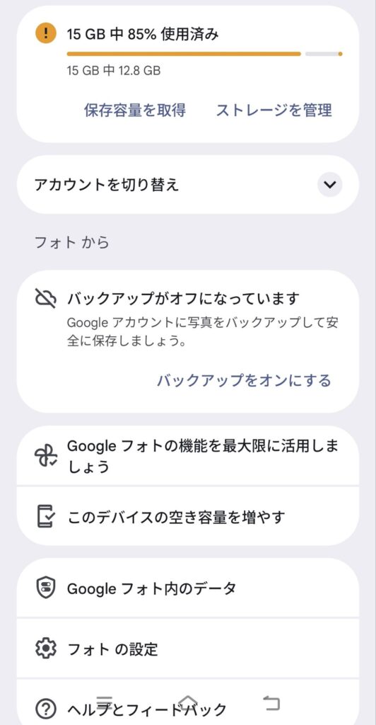 Googleフォト黎明期は、サイズはある程度縮小されるけど枚数、容量無制限でとても良いサービスだったので自動バックアップは絶対ONにすべき神アプリだったのですが、容量無制限を止めて容量15GBに制限されたあたりからおかしい事になってきました。