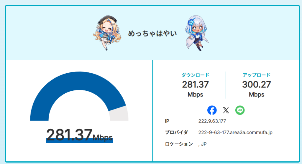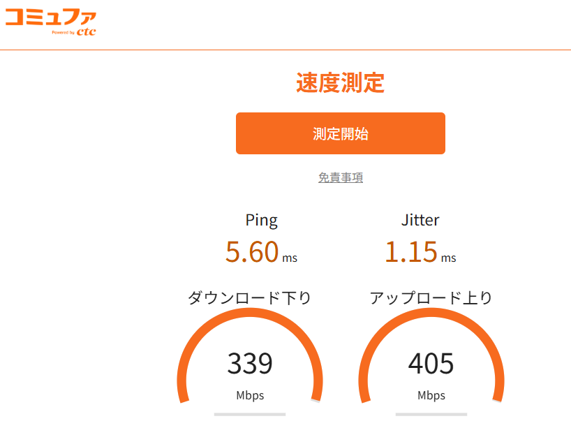 最初はプロバイダと光回線接続先のコミュファ光の測定サイトによる測定結果がこちら