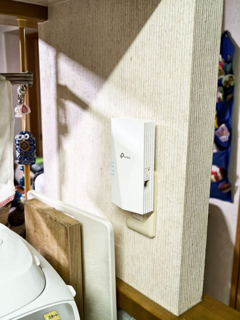 その原因は明確で、2階納戸の奥にある光回線導入口に設置されているコミュファ光設置のルーターは、有線、無線LANの両方があって一応それだけでwifi接続も可能なのですが、なんせリビングから最も遠い家の対角線上にあるためwifi強度が非常に弱い。