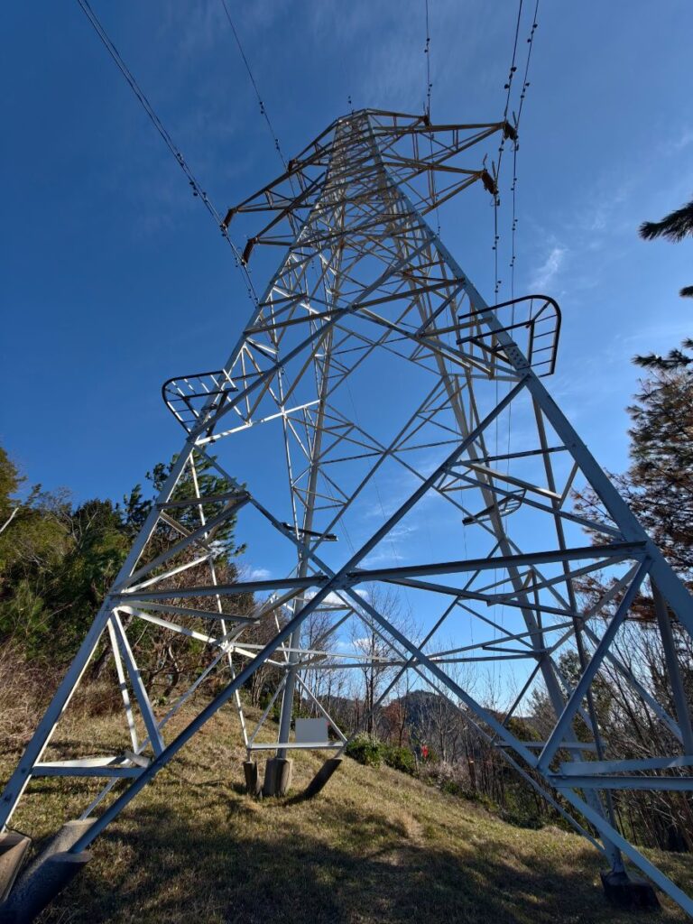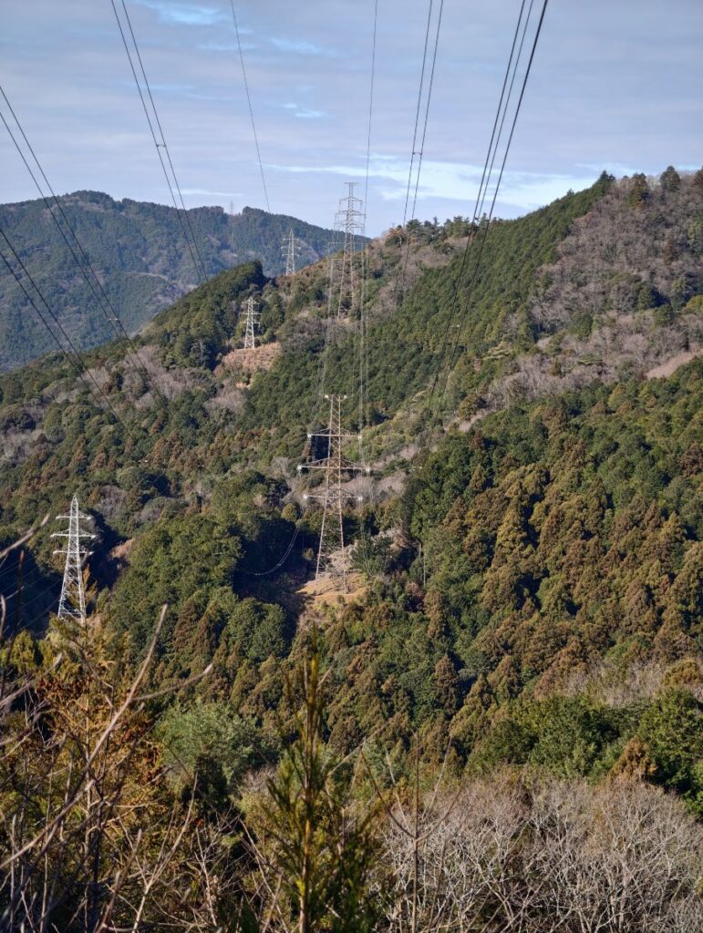 別の鉄塔が現れ頭上を高圧電線が通って別の山に向かっているなかなか見ごたえのある風景が