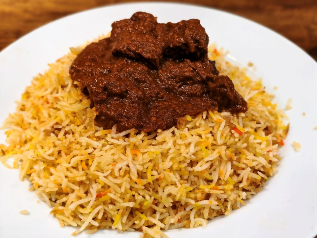 マトン肉のビリヤニで、長粒米のバスマティライスのパラっとした食感が大変美味しかったです。