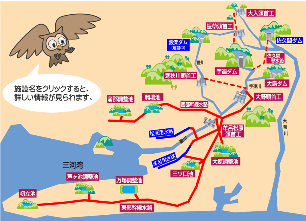 そもそも宇連ダムともう一つの大島ダム本体からは直接取水しておらず、豊川をせき止めた2つの頭首工(大野頭首工、牟呂松原頭首工)と言われる取水口から教科書にも出てくる豊川用水、松原用水などを通して東三河地区各地の調整池に貯められてそこから水道水や工業用水、農業用水として利用しているのです。