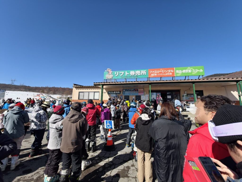 到着してびっくりの駐車場の車の満杯具合とこのリフト券購入の列