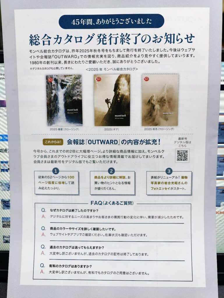 結構好きで、ここでもよくネタとして取り上げていたモンベルの総合カタログの発行が終了すると。