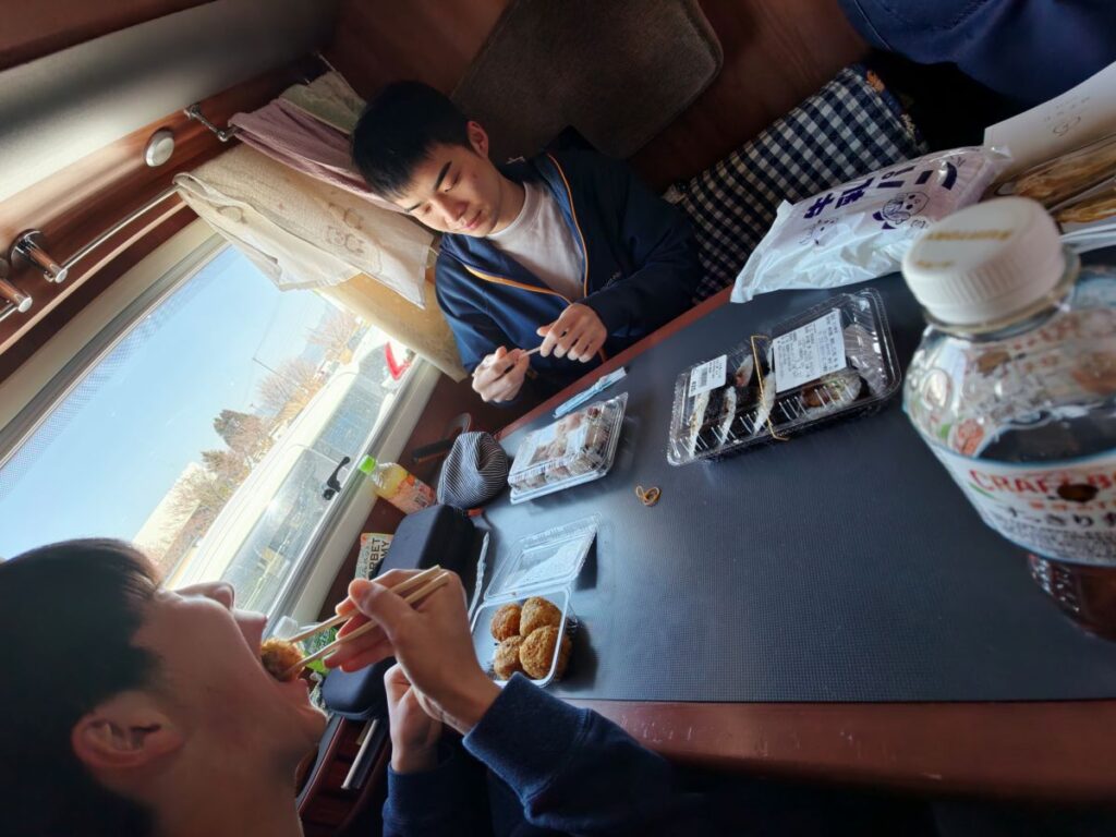 車に戻って道の駅で購入した海苔巻きや丸いジャガイモコロッケのようなものをブランチに。