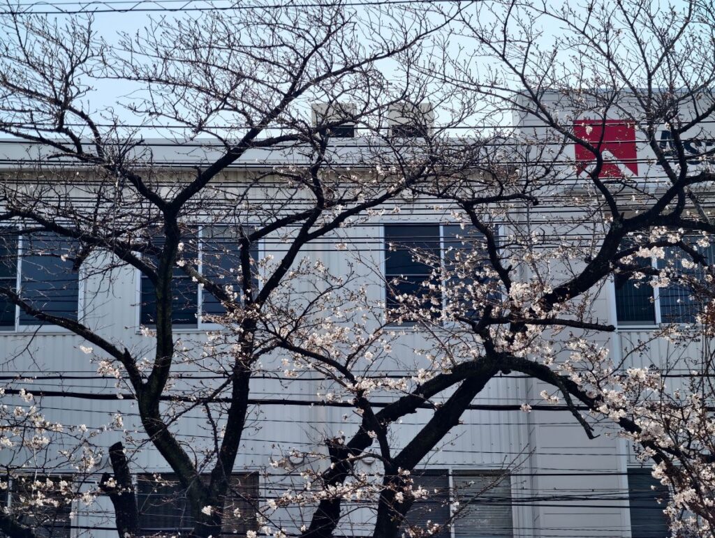 道路を挟んで反対側の旭テックさんの桜も咲いている木とそうでない木の差が激しい