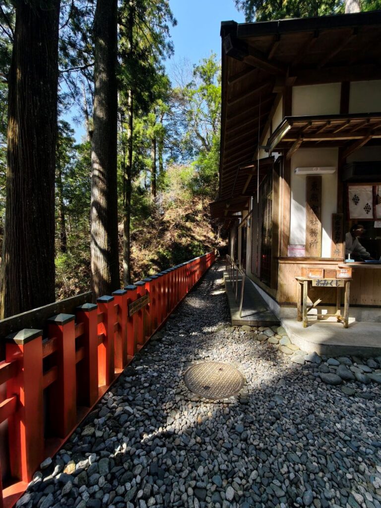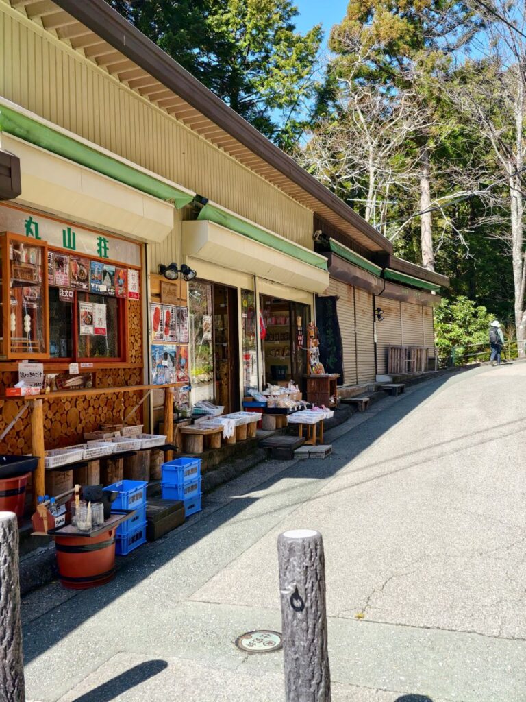 鳳来寺に一番近い駐車場に車を止めて靴を履いたら門前のお店の前を通って鳳来寺へ
