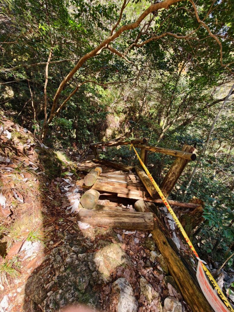 しかし登山道が整備されてからだいぶ時間が経つのかこんな感じで倒壊しかけている木道も