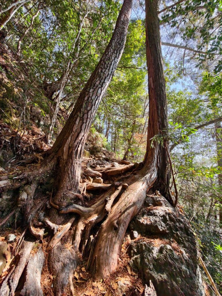 こんな立派な根を張った木の間を進みます。