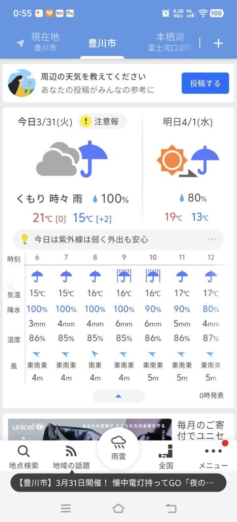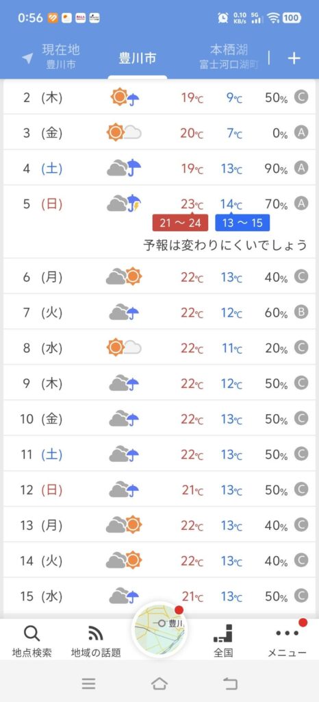 で、雨と言えば、東三河地方の水がめの宇連ダムの貯水率は相変わらず0.5%ですが、今日からこんな天気予報なのでいくらか復活してくれるんじゃないかと期待が膨らみます。