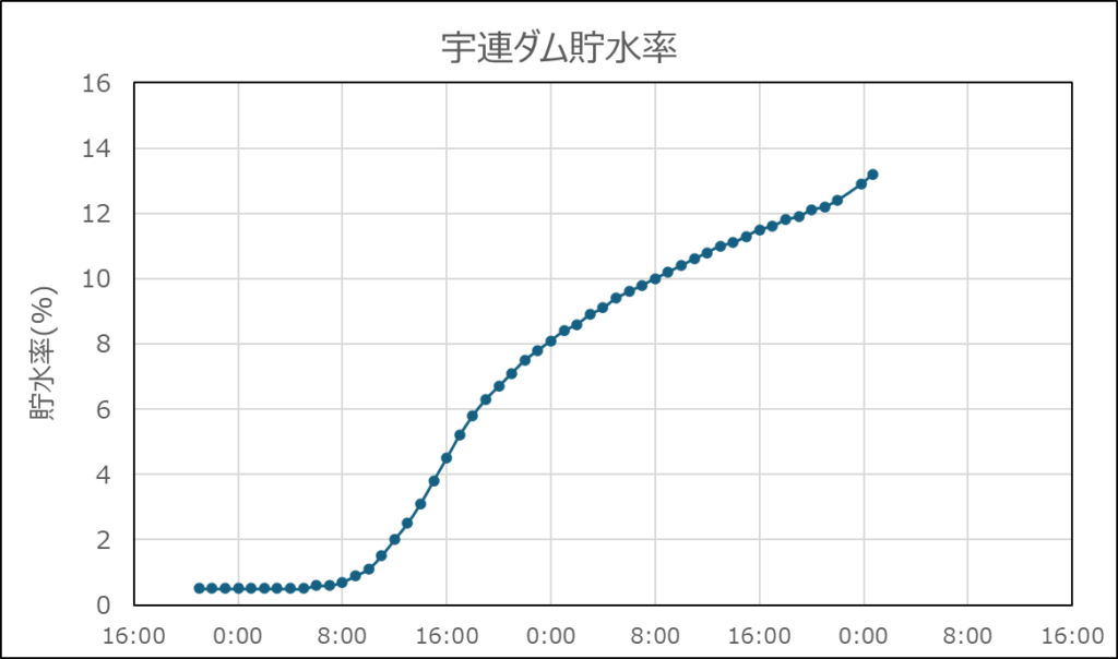 とりあえずさっきまで大雨が降っていて、貯水率に反映してくるまでタイムラグがだいぶあるからしばらく増え続けるんじゃないでしょうか?
