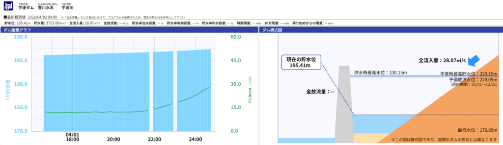 これまではXの宇連ダムのつぶやきBotから貯水率を転記してグラフにしてましたが、下の国土交通省の川の防災情報からいつでも貯水率を計算できるようになりました。