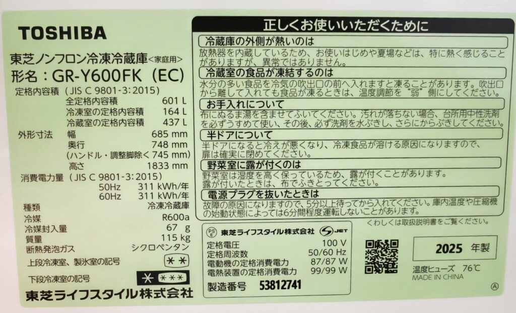2006年JIS:480kWhは、2025年JIS換算だと、624kWhになり、新しい東芝は311kWhなので、半分以下の49.8%の消費電力量ということになります。