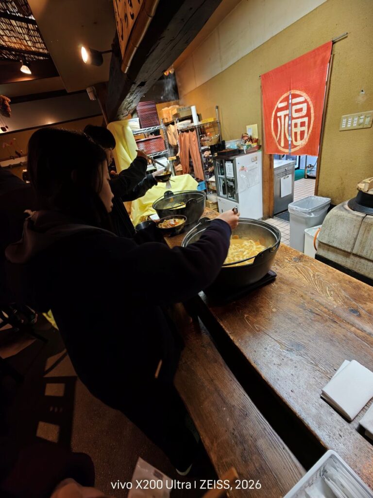 整理券をもらったら詰め放題開始まで時間があるので、先着50名までに配布されたほうとう500円食べ放題券を使って朝食とすることに。