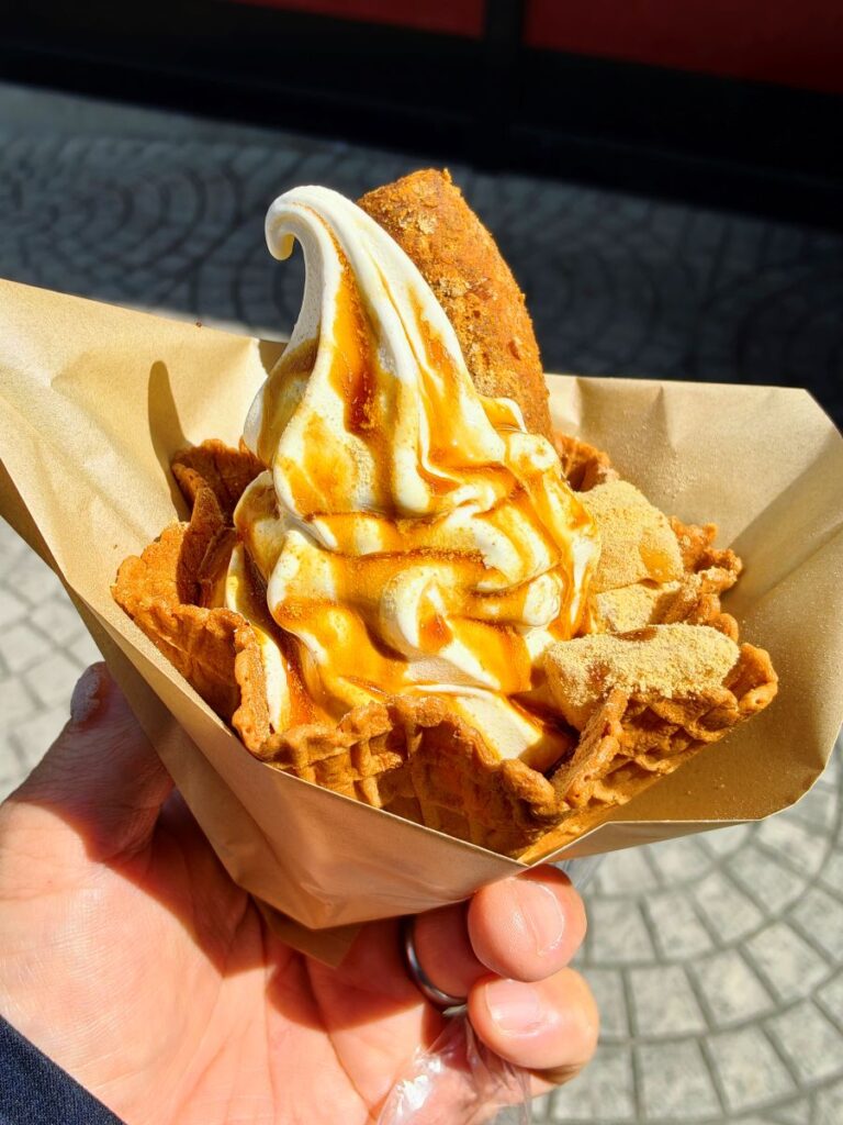 信玄餅と信玄棒を乗せてきな粉と黒蜜がまぶされた桔梗信玄ソフトです。