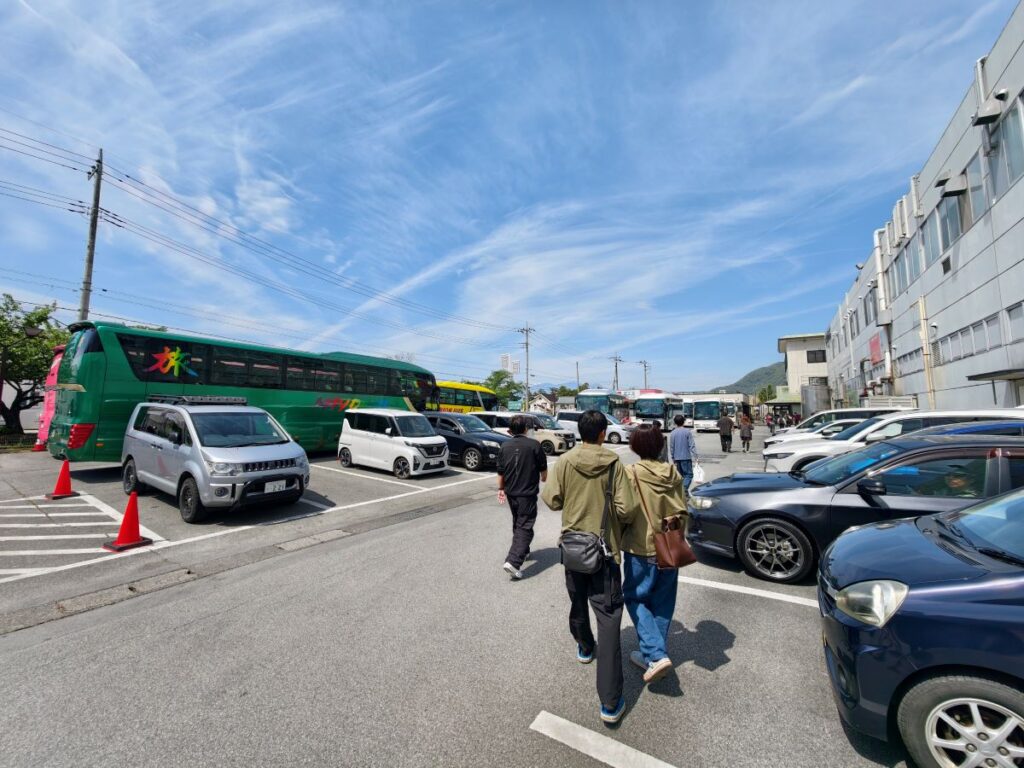 これで桔梗信玄餅工場テーマパークでのミッションは全てクリアしたので車に戻るのですが、駐車場は大型観光バスでこんな大変なことになってました(^^;)