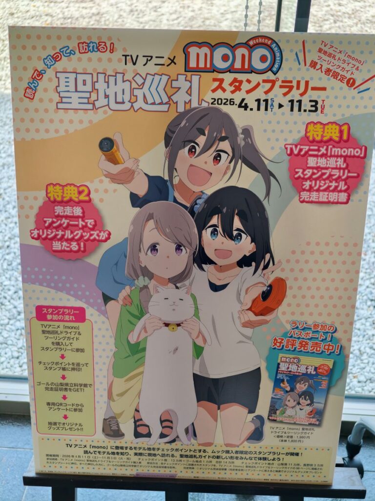 ということで、私の推しアニメの代表格の『mono』の聖地巡礼が桔梗信玄餅工場テーマパークからスタートしましたが、テーマパークで信玄餅を満喫したら聖地巡礼に行けるところまで行こうということで、次に向かったのは桔梗信玄餅工場テーマパークから最も近いスポットの山梨県立博物館かいじあむ